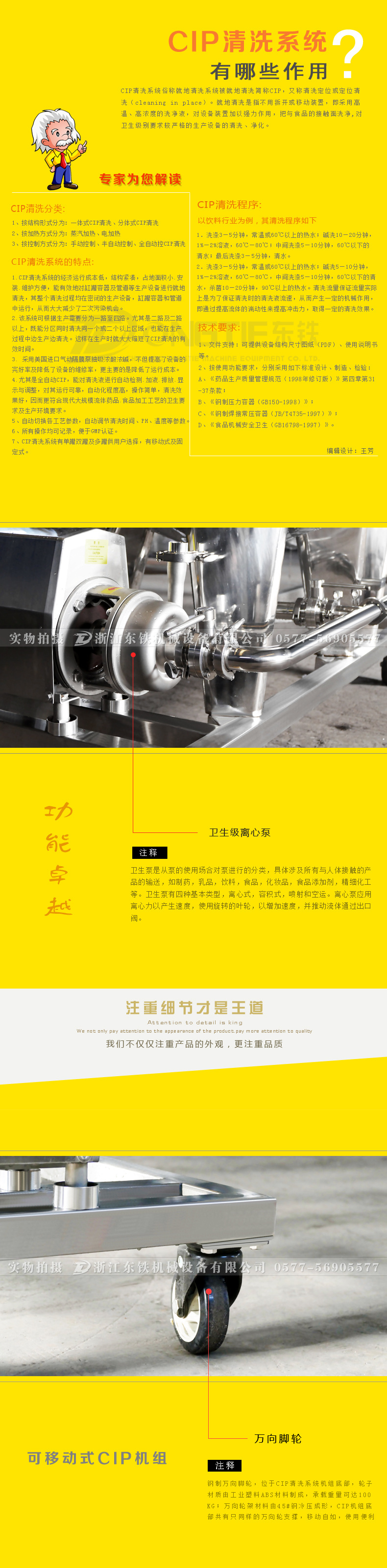 CIP清洗系統(tǒng)能保證一定的清洗效果,提高產(chǎn)品的安全性;節(jié)約操作時間,提高效率;節(jié)約勞動力,保障操作安全;節(jié)約水、蒸汽等能源,減少洗滌劑用量;生產(chǎn)設(shè)備可實現(xiàn)大型化,自動化水平高;延長生產(chǎn)設(shè)備的使用壽命。CIP清洗的作用機理化學能主要是加入其中的化學試劑產(chǎn)生的,它是決定洗滌效果主要的因素。